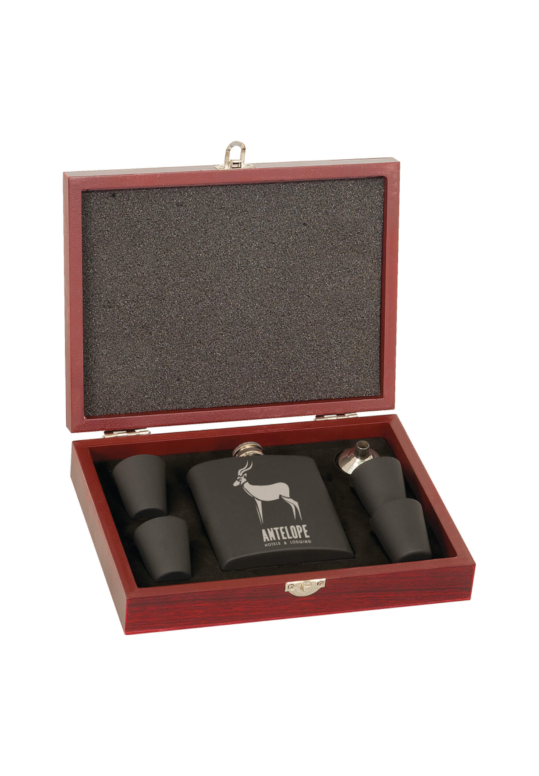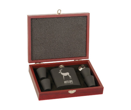 Our Laser Engravable Flask Set with Shot Glasses is the perfect canvas for any special occasion. The 6 oz Matte Black flask comes with four shot glasses and a funnel for easy filling. They will appreciate your personal touch that is expertly laser engraved for a permanent mark that will never wear away or wash off. The set also features a beautiful hinged Rosewood box for safe keeping.